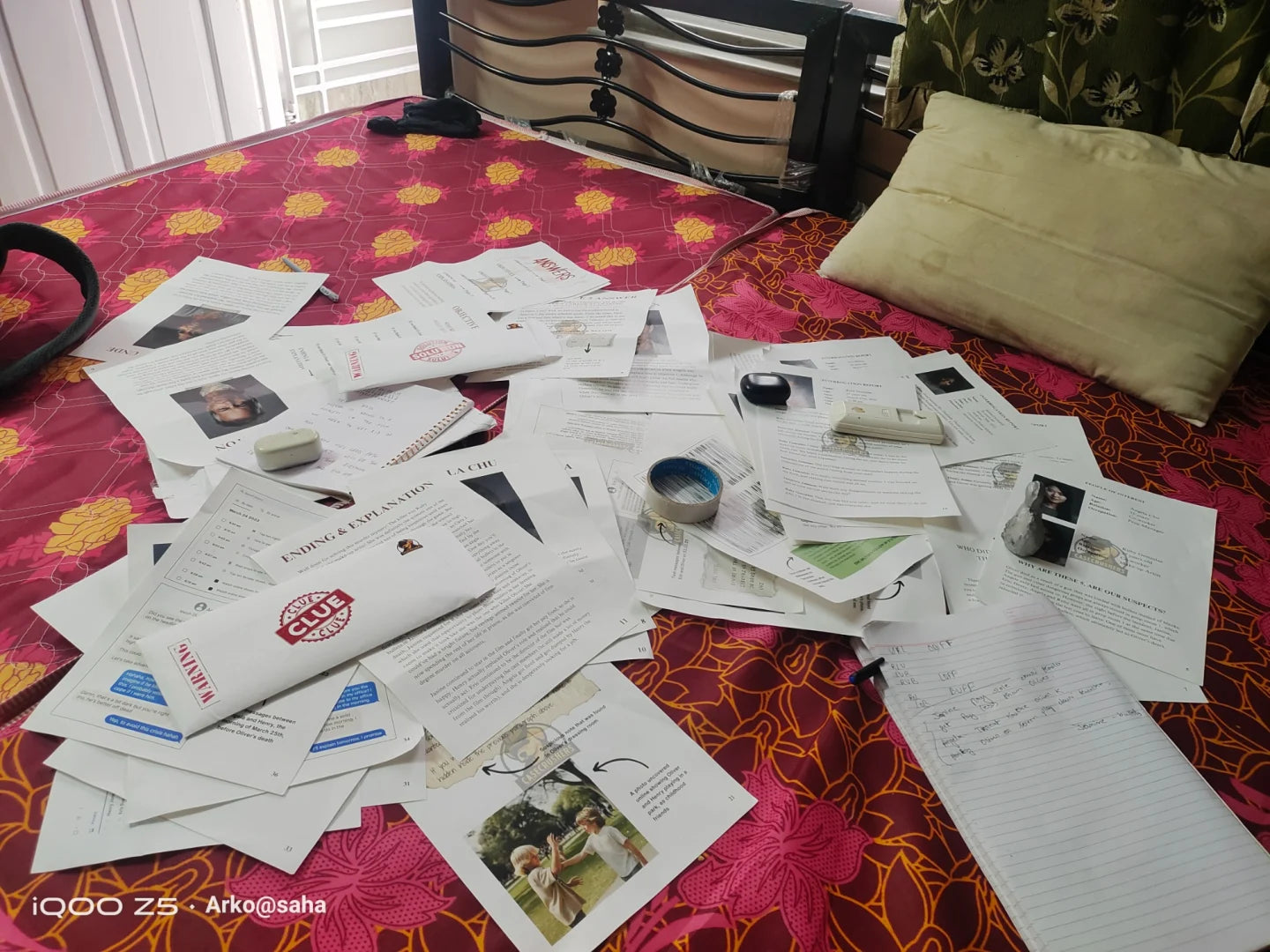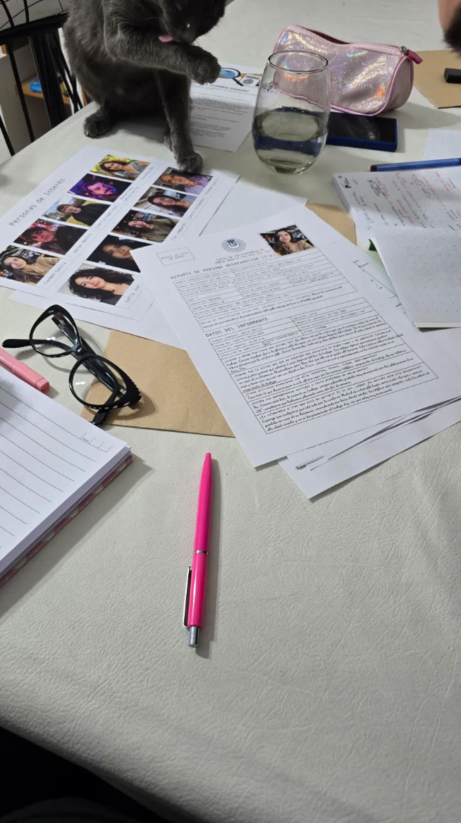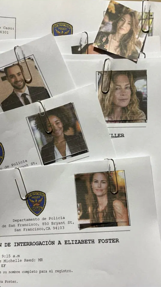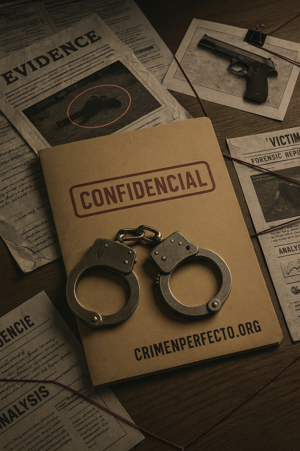 Pruebas y documentos: reportes policiales, notas escritas a mano, registros y evidencia visual.